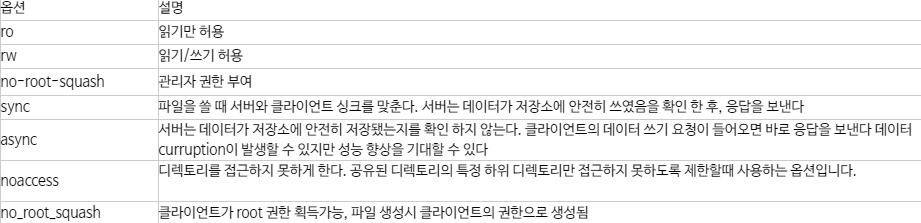 /etc/exports에서 공유할 폴더 / 접속할 IP / 권한들을 적어준다