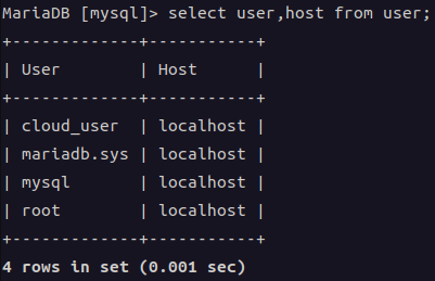 grant all privileges on cloud_db.* to cloud_user@localhost identified bt '12345';