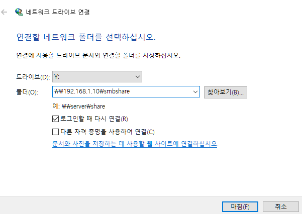 네트워크 드라이브 연결에서 ip와 위 smb.conf 파일에 추가한 section명을 적어준 후 마침